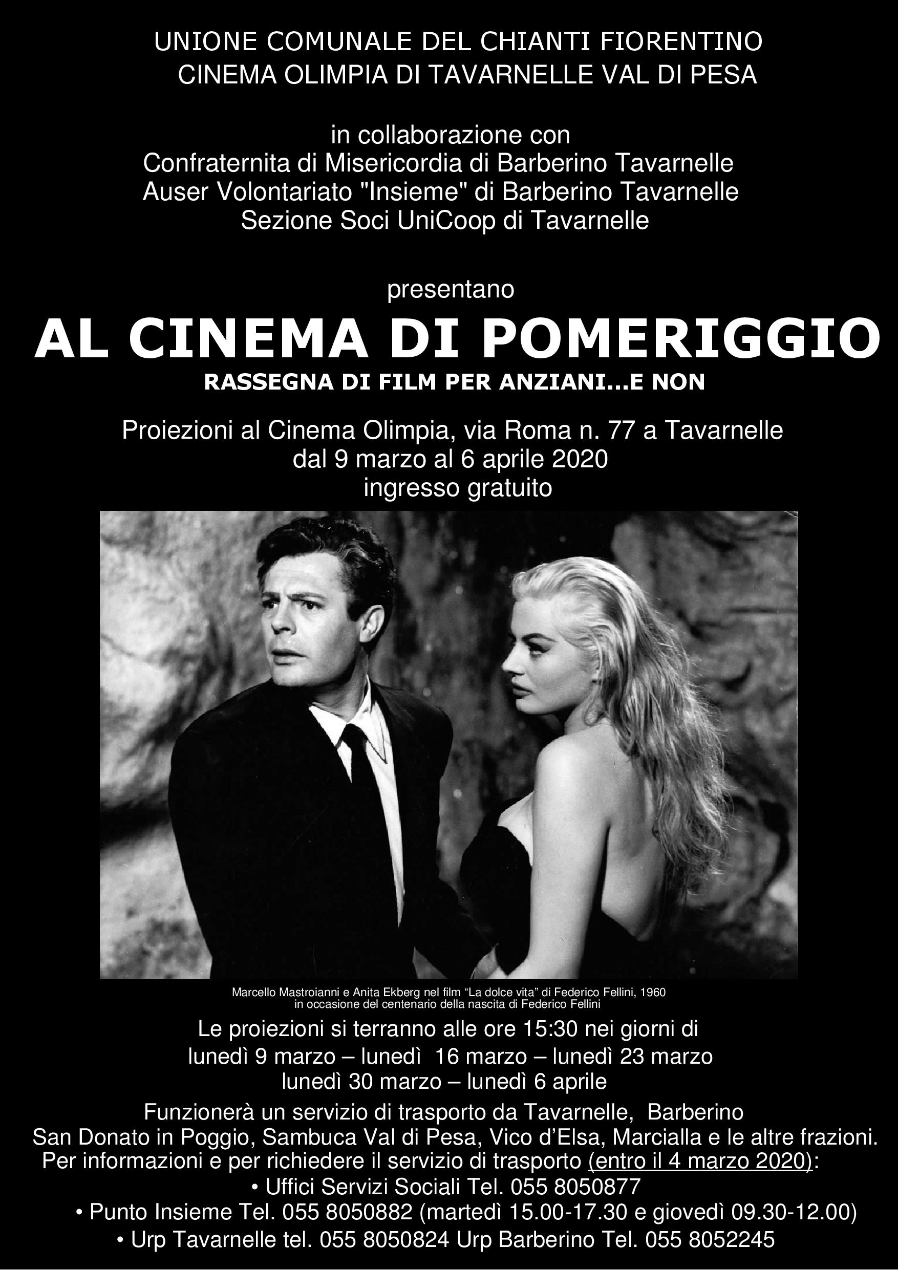 Le proiezioni si terranno alle ore 15:30 nei giorni di lunedì 9 marzo – lunedì 16 marzo – lunedì 23 marzo lunedì 30 marzo – lunedì 6 aprile Funzionerà un servizio di trasporto da Tavarnelle, Barberino San Donato in Poggio, Sambuca Val di Pesa, Vico d’Elsa, Marcialla e le altre frazioni.