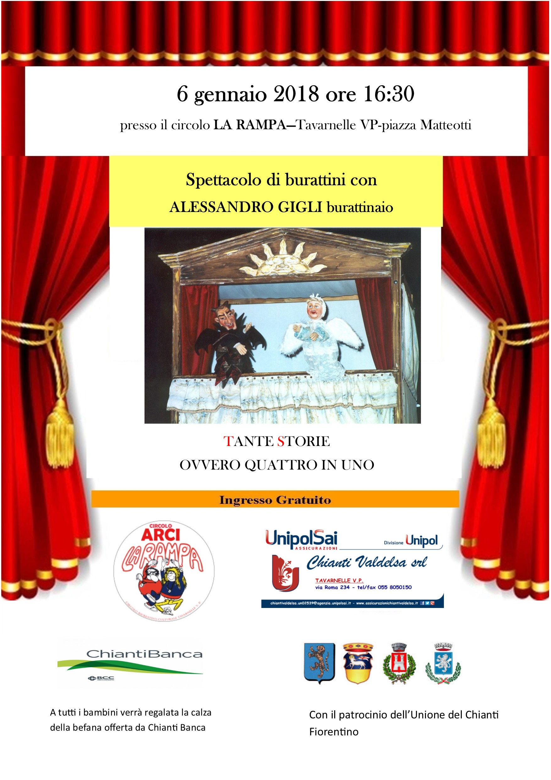 Il Circolo Ricreativo Culturale La Rampa con il patrocinio dell'Unione Comunale del Chianti Fiorentino organizza sabato 6 gennaio 2018 dalle ore 16:30 lo spettacolo di burattini "Tante storie, ovvero quattro in uno" con Alessandro Gigli. A seguire verrà offerta una calza della Befana a tutti i bambini.
