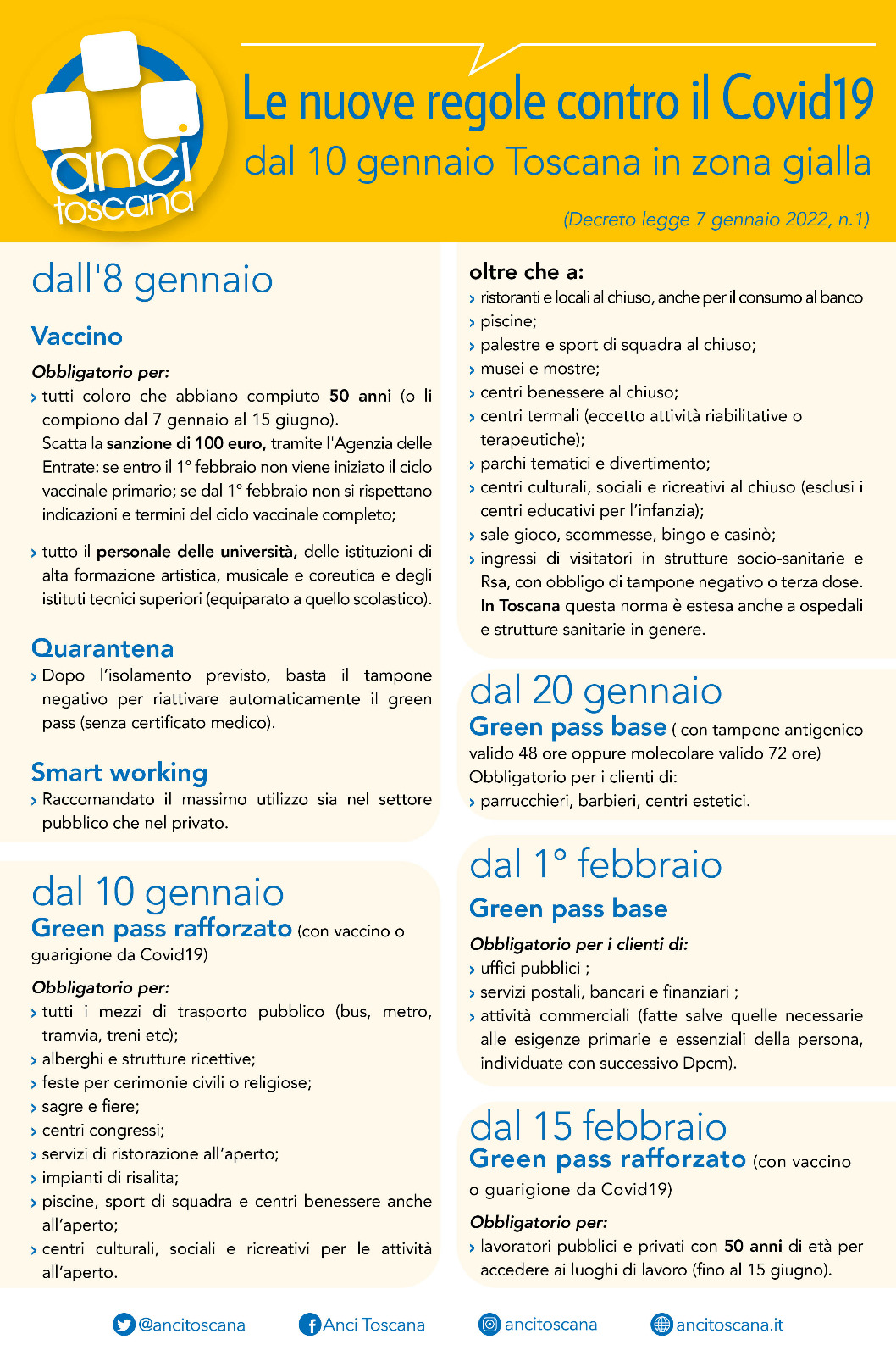 Il Ministro della Salute venerdì 7 gennaio 2022 ha firmato una nuova ordinanza che dispone il passaggio della Toscana in zona gialla dal 10 gennaio 2022, per un periodo di quindici giorni, salva nuova classificazione.