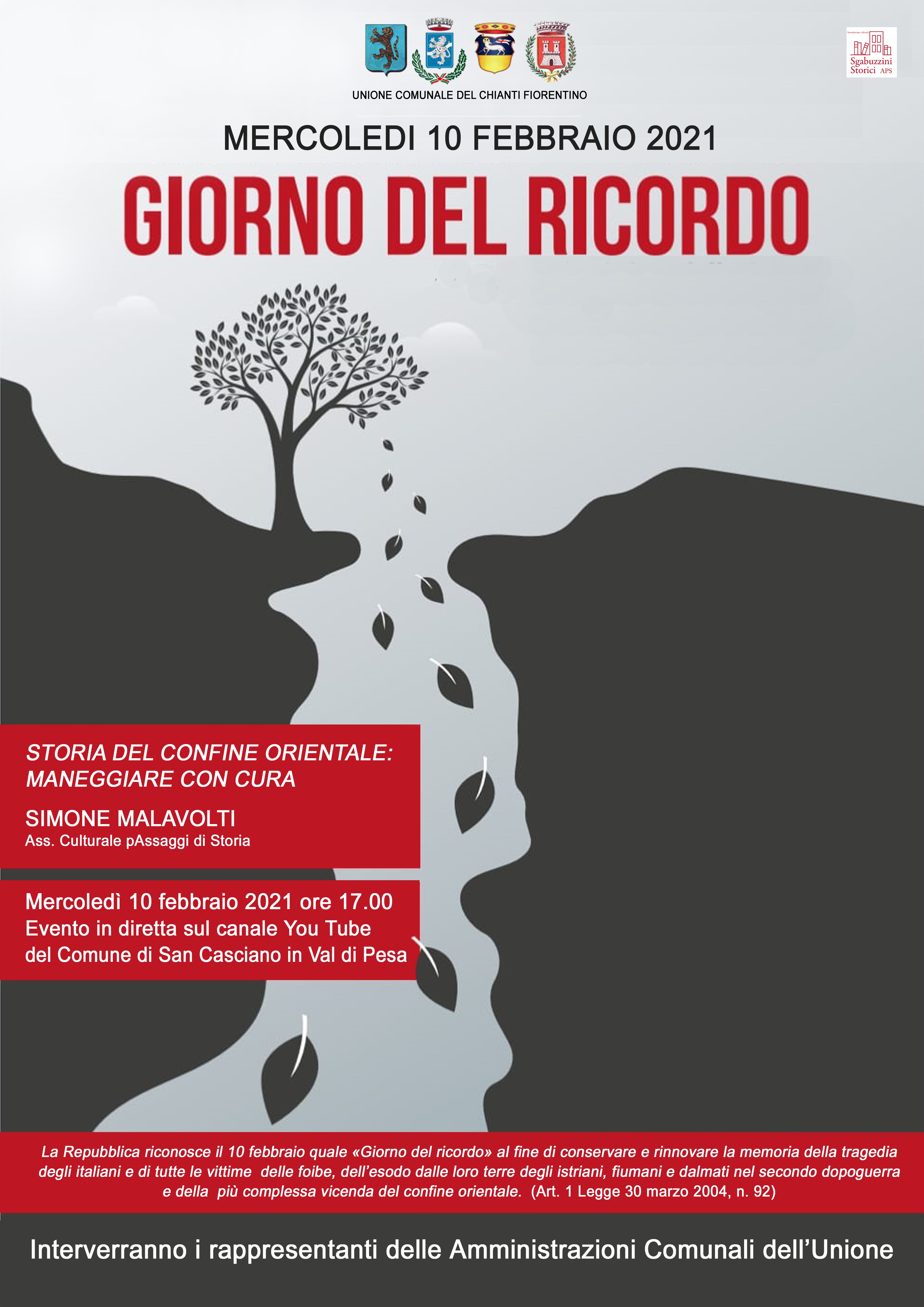 Dal canale YouTube del Comune di San Casciano in Val di Pesa, mercoledì 10 febbraio alle ore 17,00, sarà trasmesso in forma live e diffusa anche attraverso le pagine Facebook istituzionali, la conferenza “Storia del confine orientale: maneggiare con cura” con la partecipazione dello storico Simone Malavolti dell’associazione Passaggi di Storia.