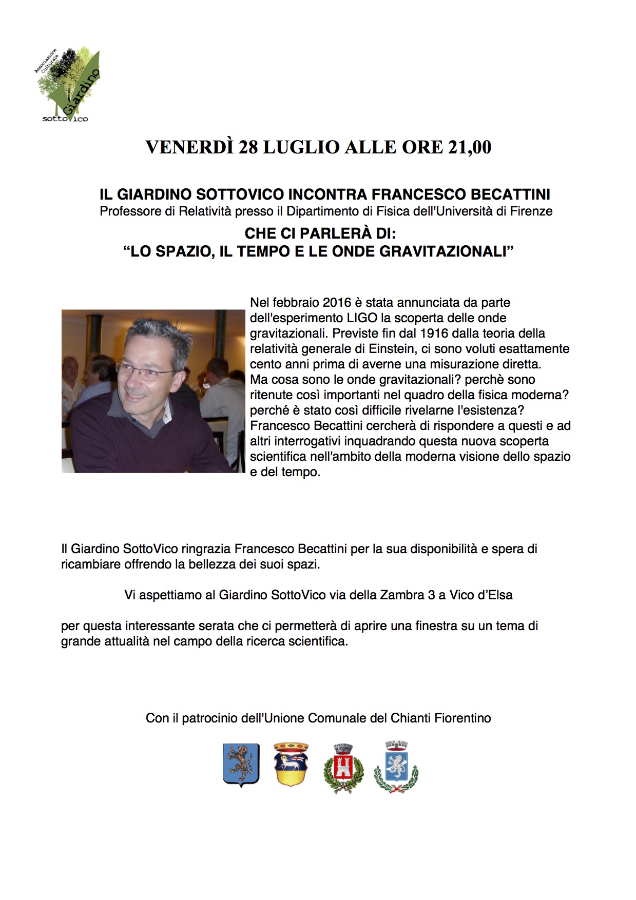 Venerdì 28 luglio 2017 alle ore 21:00 presso Il Giardino Sottovico, incontro con Francesco Becattini, Professore di Relatività presso il Dipertimento di Fisica dell'Università di Firenze.