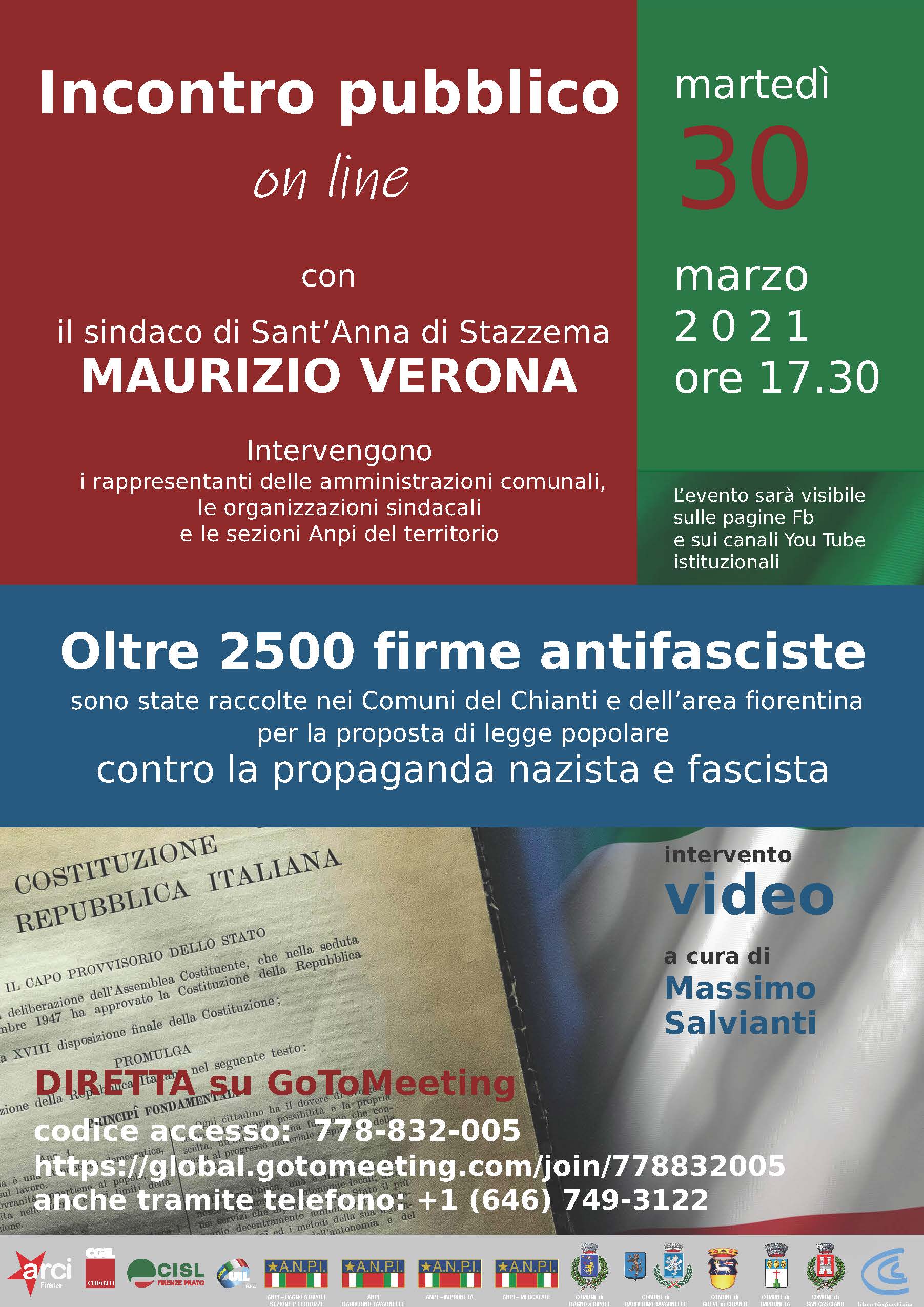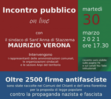 Martedì 30 marzo 2021 alle ore 17:30 si terrà un incontro pubblico on line con il Sindaco di Sant'Anna di Stazzema Maurizio Verona, con l'intervento dei rappresentanti delle Amministrazioni Comunali, le organizzazioni sindacali e le sezioni Anpi del territorio.