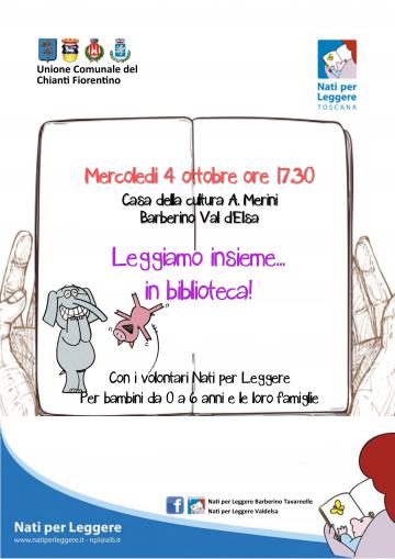 Mercoledì 4 ottobre alle ore 17.30 presso la Casa della Cultura Alda Merini a Barberino VE i volontari del gruppo Nati per Leggere Tavarnelle-Barberino aspettano grandi e piccini per le loro letture "Leggiamo insieme... in biblioteca!". Letture per bambini da 0 a 6 anni con le loro famiglie.