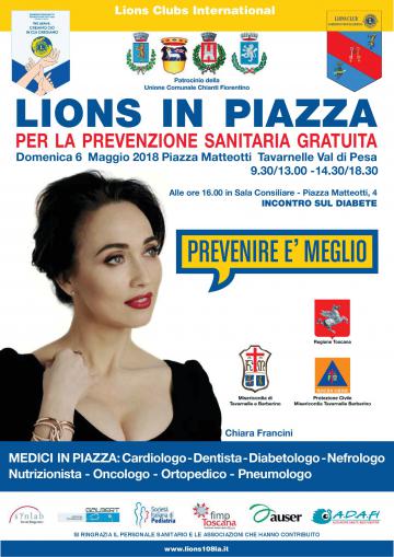 l Lions Club International - Distretto 108 La Toscana, con il patrocinio dell'Unione Comunale del Chianti Fiorentino, organizza domenica 6 maggio 2018 in Piazza Matteotti a Tavarnelle Val di Pesa l'iniziativa "Lions in Piazza".