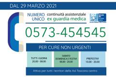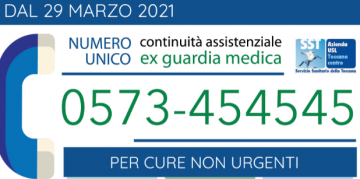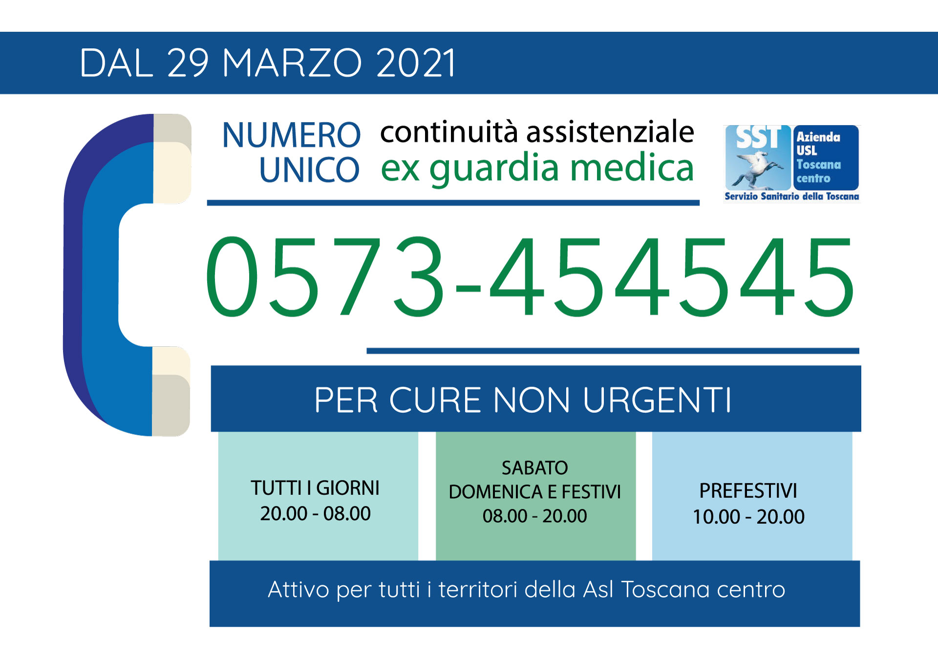 Con l'istituzione della nuova Centrale Operativa di Continuità Assistenziale entra in funzione dal 29 marzo 2021 alle ore 20:00, il numero unico aziendale 0573 454545, che va a sostituire i vecchi numeri della ex guardia medica,  in grado di accogliere le richieste non urgenti in tutti i territori dell'Azienda, nei seguenti orari: