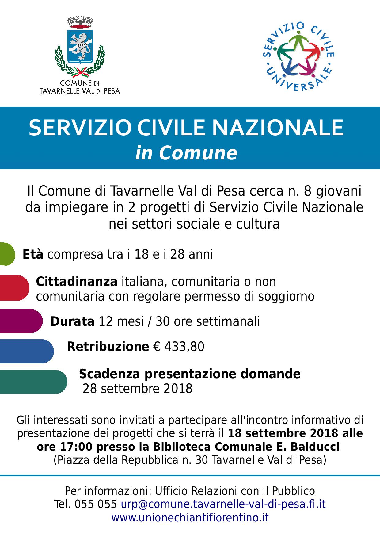 Il giorno 18 settembre 2018 alle ore 17:00 presso la Biblioteca Comunale E. Balducci (Piazza della Repubblica n. 30 Tavarnelle Val di Pesa) si terrà un incontro informativo per i giovani interessati durante il quale verranno presentati i due progetti.