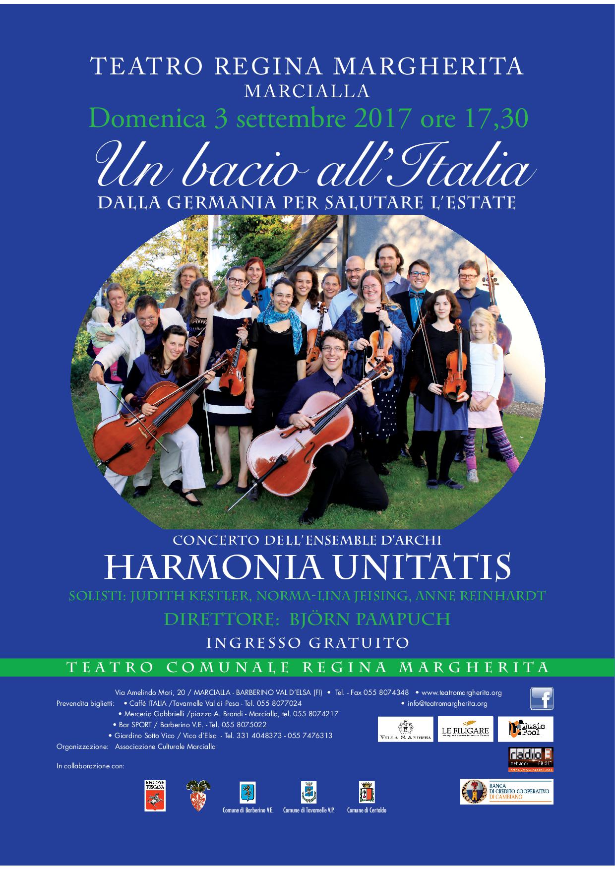 Concerto al Teatro Margherita di Marcialla Domenica 3 settembre 2017 alle ore 17:30 al Teatro Margherita di Marcialla si terrà il concerto Un bacio all'Italia Concerto dell'ensemble di archi Harmonia Unitatis, dalla Germania per salutare l'estate Ingresso gratuito Galleria fotografica